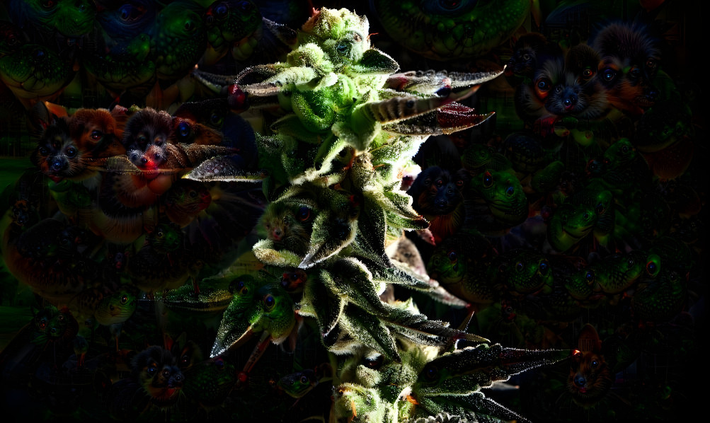 Prompt: A giant "Caterpillar from Alice in wonderland" smoking a joint holding a bong in his lap, laid back against the base of a "massive living cannabis plant growing out of the ground" and blowing huge clouds of colorful smoke surrounded by blooming poppy flowers of all colors.