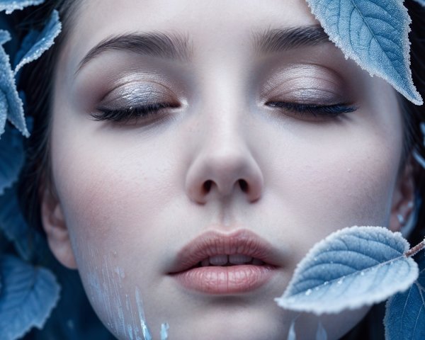 Prompt: ethereal surreal portrait of a woman’s face dissolving into translucent blue leaves and crystalline frost, delicate veins of nature blending with soft porcelain skin, closed eyes, reflective sapphire lips, gentle light and mist, flowing textures and organic motion, dreamlike and poetic atmosphere, emotional serenity, detailed yet fluid composition, fine art photography aesthetic, cinematic glow, icy elegance, masterpiece, trending on artstation, 8K ultra realistic,