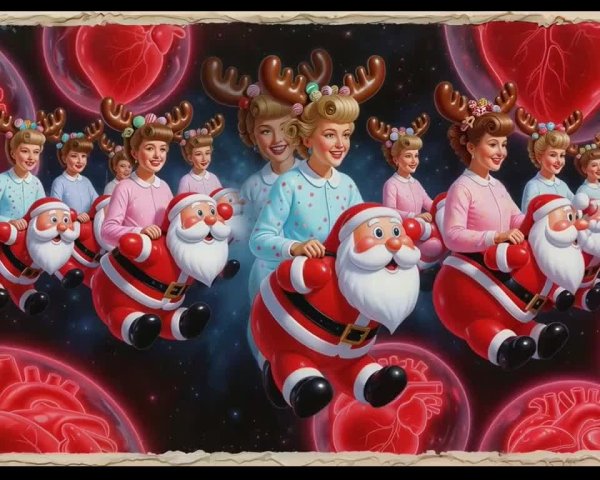 Prompt: A close-up, adorable portrait of a reindeer with large, expressive brown eyes looking directly at the camera. The reindeer has thick, textured brown fur and large antlers that are festively decorated with a string of glowing colorful Christmas lights (red, green, blue, yellow) and shiny Christmas baubles. Snowflakes are gently falling in the background, which is dark and out of focus, creating a magical winter atmosphere. The style is a blend of hyper-realism and 3D animation, emphasizing cuteness and holiday spirit.