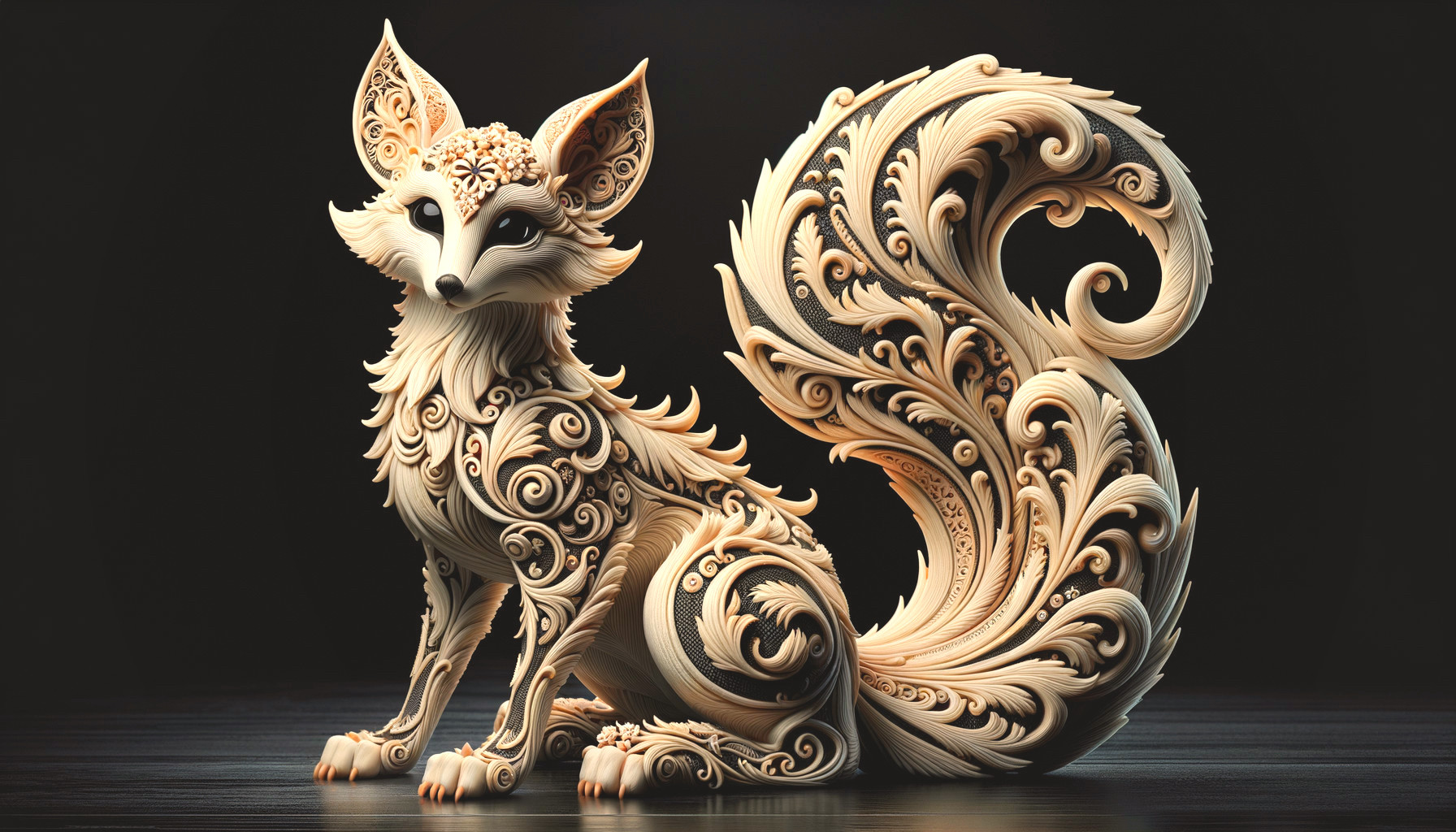 • Prompt: Create an intricately carved ivory-colored figurine of a mythical fox-like creature. The creature features large, deep black eyes with a soulful gaze. Its entire body is adorned with elaborate floral and filigree patterns, giving it an aura of elegance and complexity. Each fur detail is meticulously crafted to mimic the layering and texture of real fur, while the patterns themselves contain swirls, leaves, and flower motifs. Background is matte black The creature's ears are pointed and embellished with additional decorative elements, adding to its mythical essence. Its facial expression is serene, with a small, closed mouth that conveys a gentle demeanor. The texture of the carving resembles soft ivory or bone, with subtle variations in color that give it a lifelike quality. The figurine is positioned sitting on its hind legs, with a long, ornate tail curling around one side, contributing to a balanced and graceful composition. Its paws are detailed with individual toes and more pattern work, resting upon a base that is also richly decorated with floral designs and abstract elements that resemble ocean waves or clouds, adding a sense of movement to the static piece. The background is blurred, ensuring the focus remains entirely on the detailed artistry of the figurine.