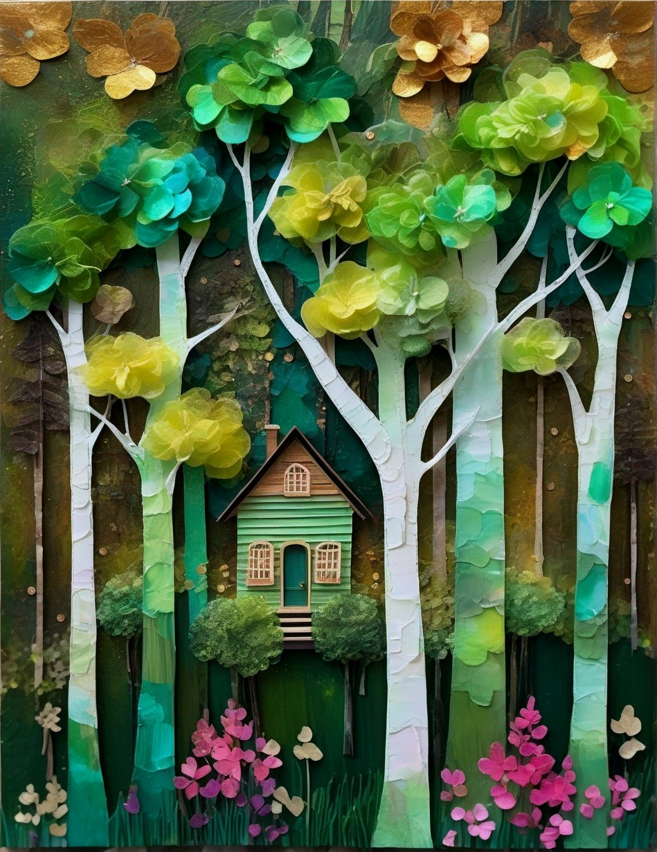 • Prompt: a small cottage home made from colorful wood, in a forest with flower-trees, not too busy; tissue paper collage and alcohol ink with overpainted metallic highlights; coherent, balanced composition, award-winning, one image of trees in background in shades of green, light green, or green-brown, one image of the cottage in the foreground with vivid colors