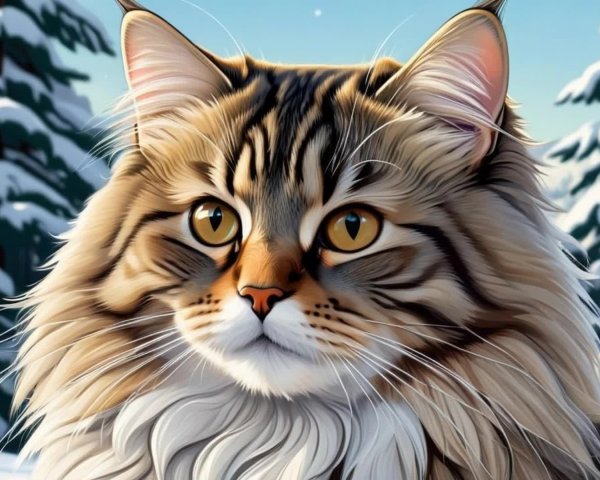 Prompt: A brightly colored, vibrant small town where the backdrop is made up of multicolored houses and green plants. In the foreground is a beautiful maine coon cat with long wavy fair hair joyfully wearing patterned clothes, her face brimming with a happy hippy smile. The colors are vivid and full of energy. This is a high-definition scene.