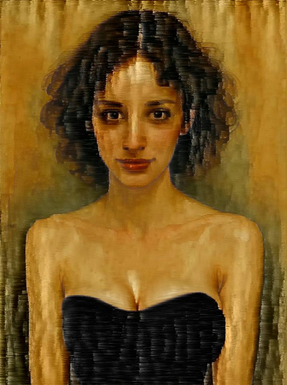 Her presence is a blend of iridescent Art Nouveau patchwork, where colors shimmer and shift like reflections on water.