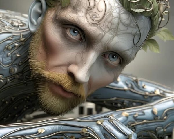 Prompt: A futuristic scene featuring a partially translucent and glitching humanoid figure sitting gracefully amidst a backdrop of high-tech machinery. The figure, appearing gender-neutral with a sleek and elongated body shape, has skin that is composed of fractal-like fragments in various shades of pale pinks, blues, and purples, emphasizing a digital aesthetic. Short, shaggy black hair frames the face, which possesses angular features and closed eyes, conveying a serene expression. One arm is lifted slightly, with the hand gently resting on the neck, while the other arm is positioned across the torso. The background consists of an array of dark, metallic machines with subtle illuminated accents in shades of blue and green, enhancing the futuristic ambiance. The overall composition evokes a sense of tranquility mixed with an unsettling, distorted digital reality.