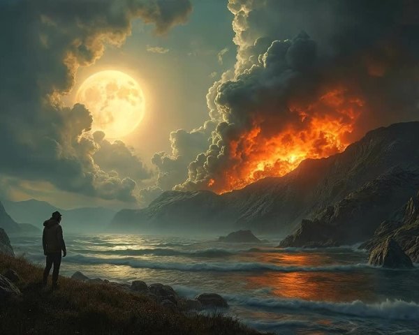 The style is hyper-realistic and intense, with a dramatic lighting that accentuates the texture. The background is black and blue, adding to the dramatic and otherworldly feel, dreamy and regal serenity.