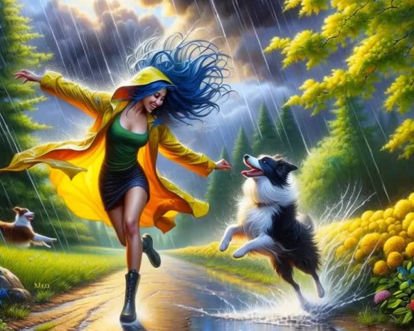 Prompt: Beautiful woman with long wild blue hair in a yellow raincoat is playing with a border collie on a deserted road in the spring rain. Refreshing atmosphere, enjoyment and emotional connection between them.