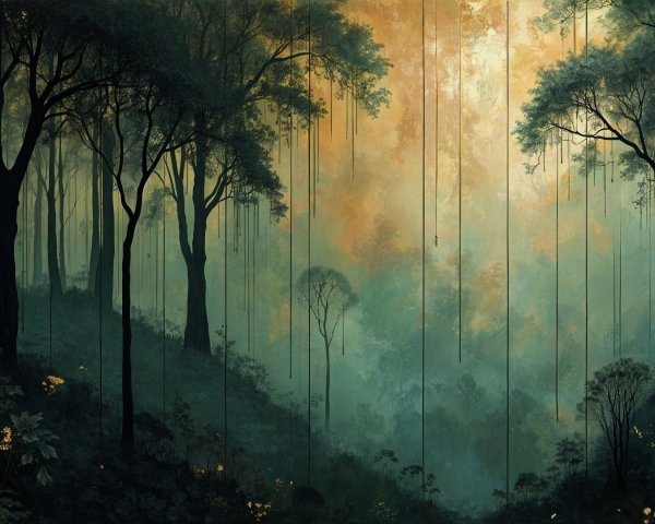 Lush vegetation, cascading raindrops, gray storm clouds, intricate brushwork, rich colour palette, dynamic lighting contrasts, masterful realism.