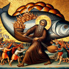 Prompt: the Easter Bunny on the way to work. he carries an egg-shaped briefcase. On the street corner, Jesus smiles mildly as he holds up the glowing cross.. Oil painting, colorful, bright, painted impasto with thick palette knife. A child is crying. The supermarket lights up in seductive colors. It's dark outside. The evil eggs are pulsating.