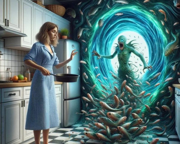 Prompt: A girl with translucent hair that drifts upward like smoke, sprouting tiny glowing fish. Her feet dissolve into paint that spills across the floor. Pastel color palettes and dreamy linework in the style of Loish
