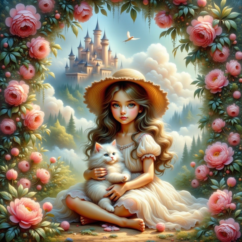 Prompt: A young girl with long, wavy hair wearing a straw hat and a delicate white dress sits gracefully in a floral archway, holding a fluffy white cat with striking blue eyes. Behind her, a majestic castle rises against a bright sky, surrounded by lush greenery and vibrant pink peonies. The scene emanates a fairy-tale atmosphere, blending innocence and nature.