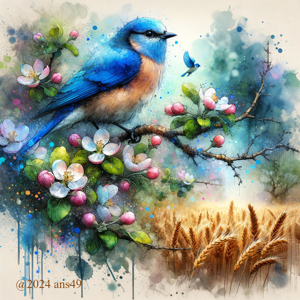 • Prompt: Blue tit sitting on a branch with apple blossoms, watercolor, soft background with splatter, trees and grain field