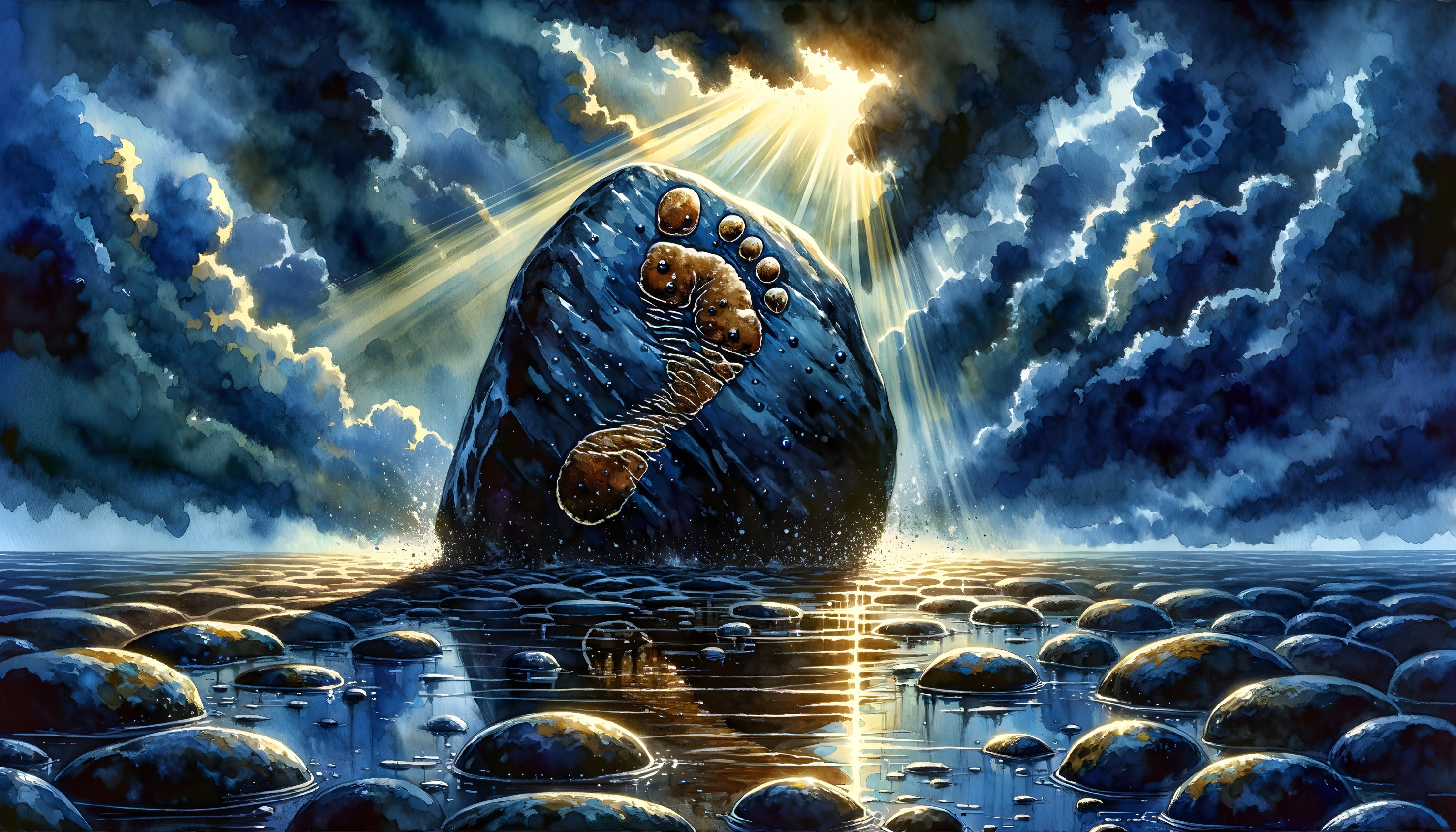 • Prompt: A large footstep on a huge shiny black stone, both the footstep and the stone are filled with small raindrops. The solitary rays pierce the black clouds that illuminate the footstep. Watercolor with acrylic, wet on wet. colorful, vibrant colors, indigo blue and black, highly detailed, 16k, award winning. Background a puddle of deep blue water. The sun's rays generate blue and gold reflections.