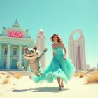 Prompt: One: Create an image featuring a stylish young woman standing confidently in front of a vintage illustration of a flying saucer. She has a sleek bob hairstyle, dyed black, and wears large round red sunglasses. Her skin tone is fair, and she has bold red lipstick accentuating her striking features. The woman is dressed in a colorful, retro-inspired dress with vertical stripes in shades of red, yellow, and blue, cinched at the waist with a black belt, and is topped with a cozy black coat featuring a soft gray fur collar. She is a sort of stylized deity with a blue complexion, surrounded by traditional Japanese motifs; The overall composition is bold, featuring a tapestry of intricate patterns and colors that evoke a sense of cultural richness and zen serenity.