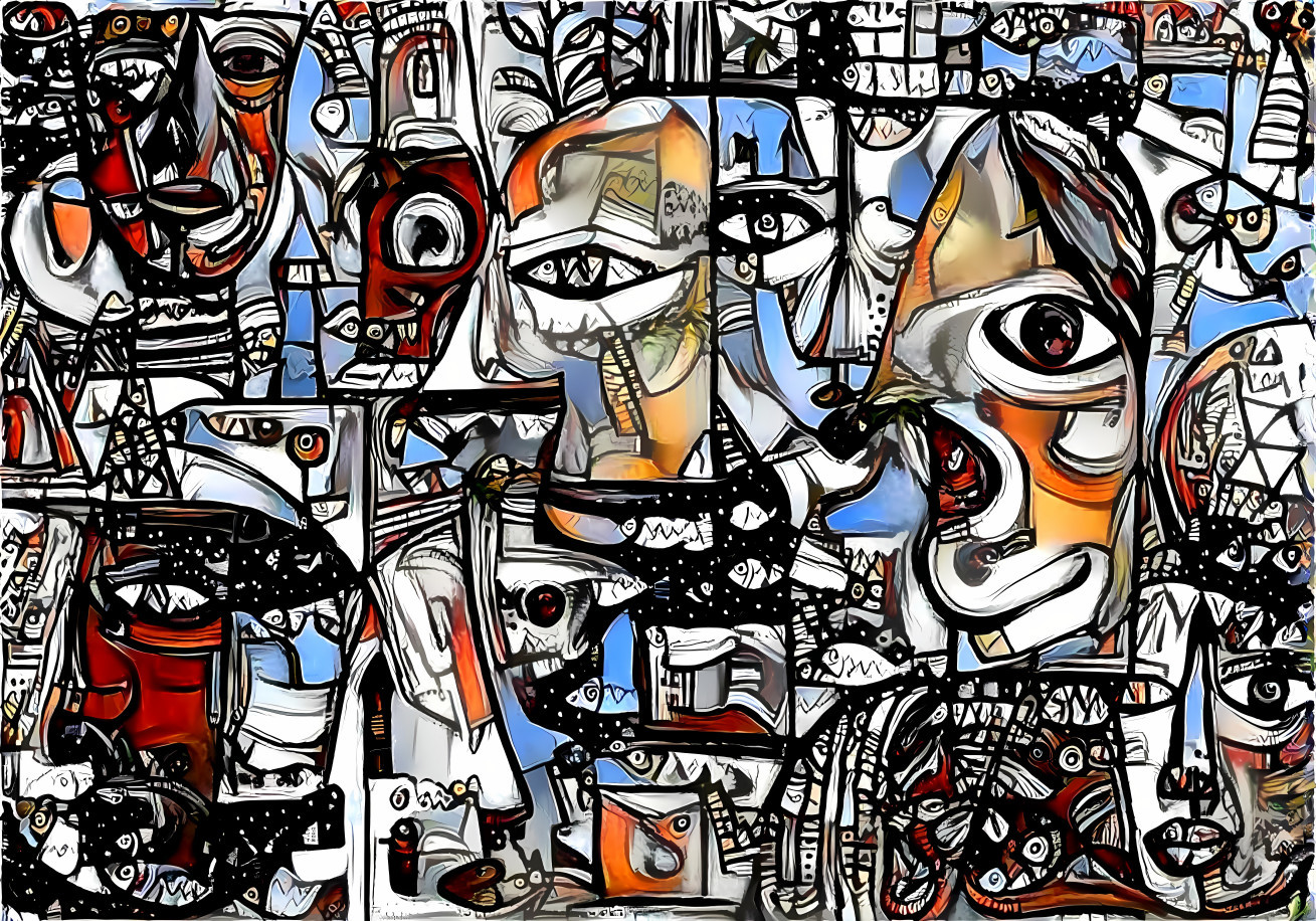 Prompt: fine art landscape by Marc Chagall and Paul Klee, shining paints, glowing lights, orbs, witches, mixed media art. faces of beauty. Buildings made of eyes and glass.