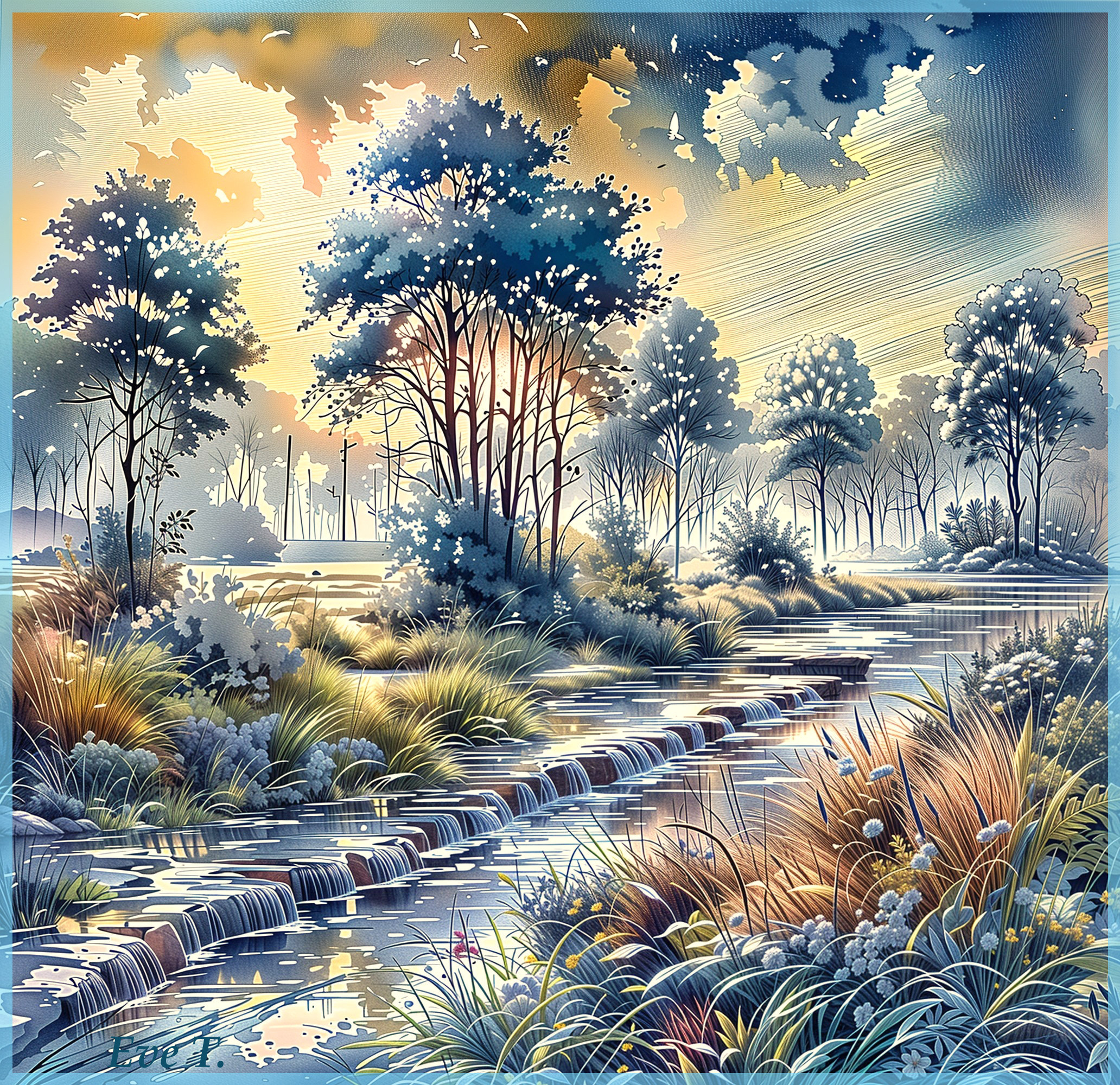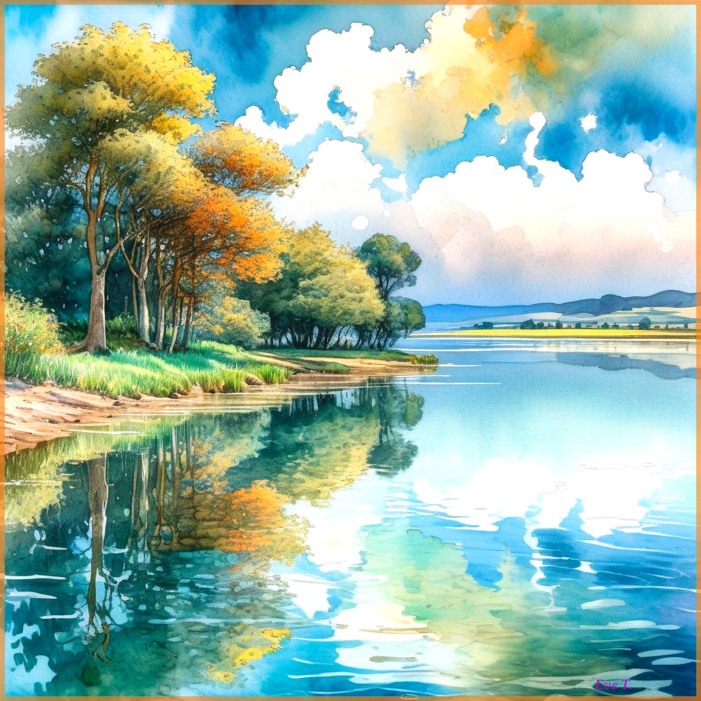 • Prompt: a semi-abstract deeply-tinted watercolor with pen and ink painting of the calm reflecting water at the shore of a large lake, by Claude Monet and Gustav Klimt