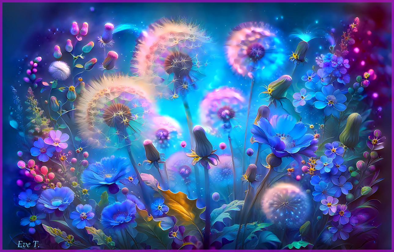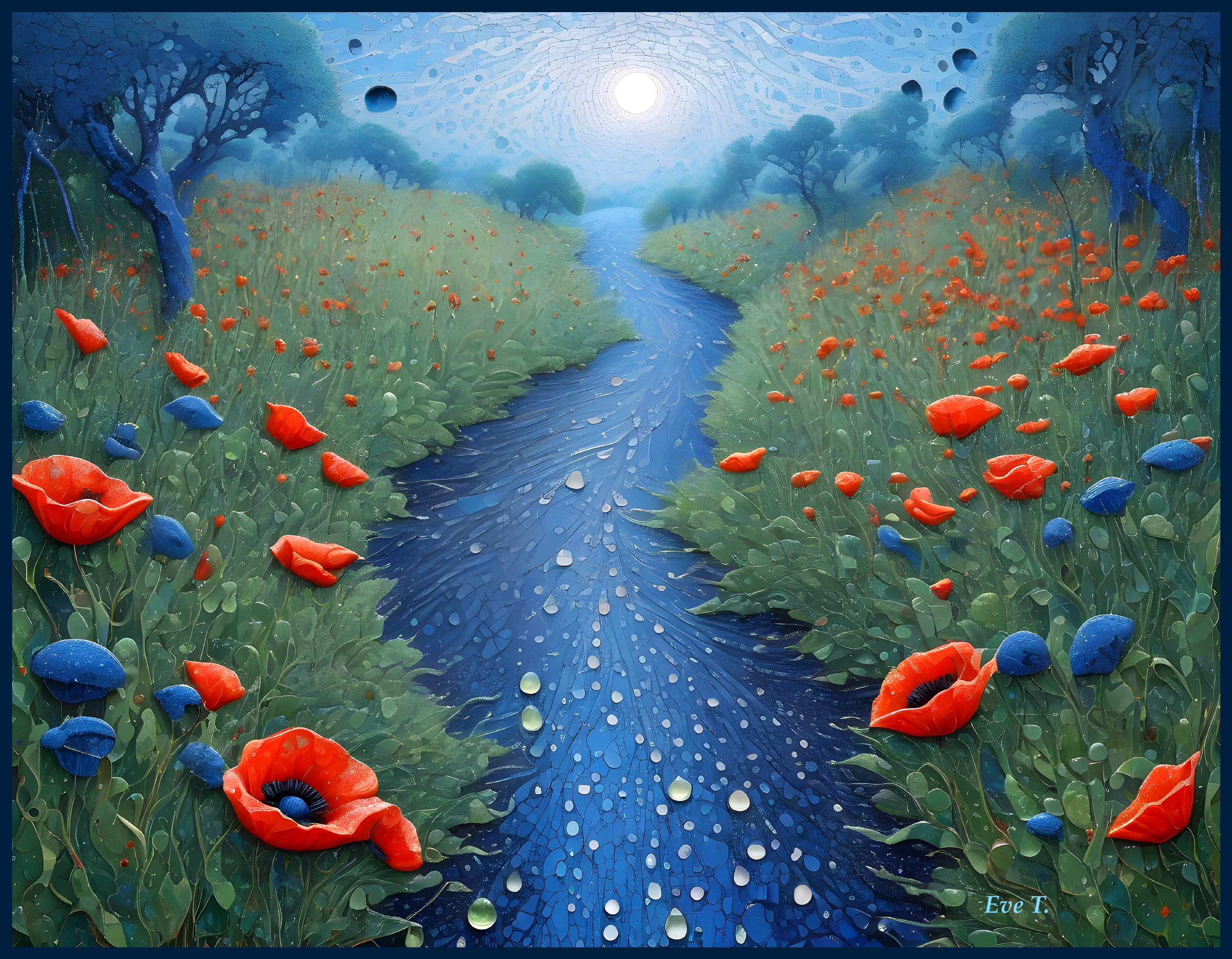 • Prompt: Surrealism, a stream of raindrops in the air, magical’ elegant, blue, poppies and green foliage ,in the style of El Anatsui, by Kuroki Mitsuko