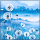 A vibrant still life featuring a blue poppies arranged in a clear vase, with a draped aqua fabric. This image is of a textured impasto oil painting featuring abstract blue poppy flowers. The defining characteristic of the artwork is its heavy use of paint applied with a palette knife, which creates a striking 3D, textured effect on the canvas. Modern/Contemporary abstract with Impressionist influences. Impasto, using thick layers of oil or acrylic paint applied primarily with a palette knife.