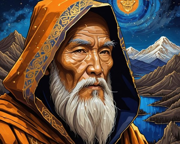 Prompt: Painting using the kintsugi technique throughout the painting. An old wizard's face with a monk's hood and a beard. Mountain scenery in the background. Night sky. Dominant colors: brown, orange, blue, and gold for the kintsugi repairs.