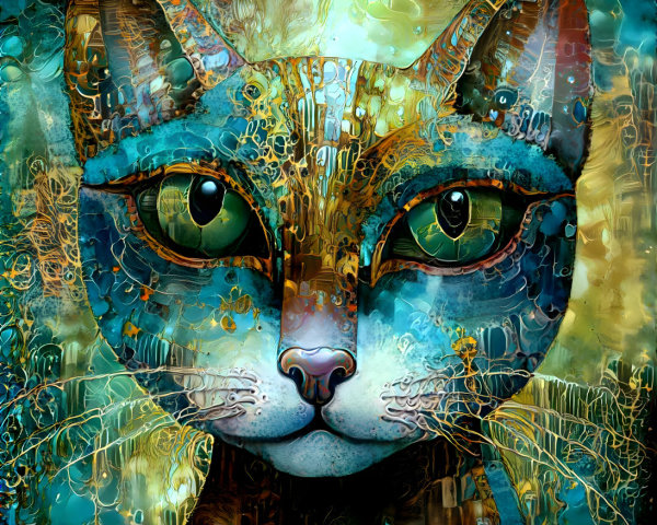 Prompt: Golden Ratio, Surreal and captivating, ultra detailed, gorgeous intricate alcohol wash acrylic oil on canvas. Create an image of a young woman sitting gracefully next to a white cat. The woman has a porcelain skin tone with delicate, symmetrical facial features, including large, expressive green eyes and full, red lips. Her hair is dark brown, styled in loose waves with a few strands cascading down, and she wears a floral crown with small black fabric and orange accents. She is dressed in a stunning black gown adorned with vibrant orange flowers that pop against the dress’s dark fabric, highlighting her slender frame. The background features soft, abstract swirls of teal and hints of brown, complemented by branches that encircle the scene and orange flowers blooming from them, creating a harmonious composition. The cat sits by her side, looking regal with its bright yellow eyes and fluffy white fur. The overall tone of the image should evoke a sense of enchanting beauty, with a slightly surreal and artistic flair.