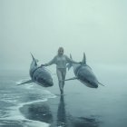 Prompt: Photorealistic sculpture of a female human figure made of clear water, brandishing a crystal sword, water droplets splashing, dynamic motion, sunlight shimmering through the water, reflecting on the surface, high-speed photography, shallow depth of field, bright and airy atmosphere, light blue sky background, cinematic natural lighting, golden hour, intricate details, textures of water and crystal, volumetric lighting, lens flare, chromatic aberration, 8k resolution, professional photography.