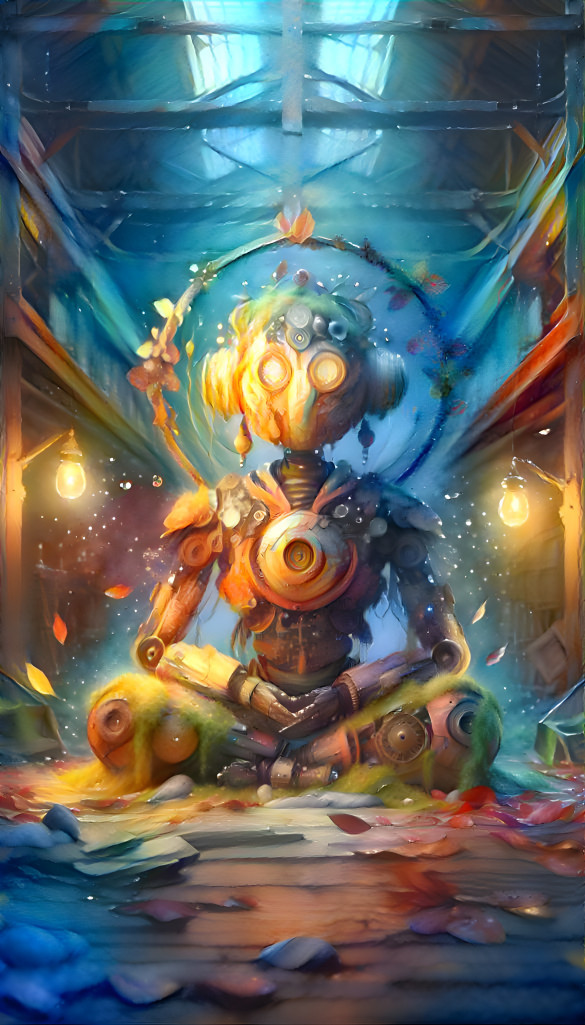 Prompt: Rusty and battered anthropomorphic smiling WALL-E, whimsical and eerie environment, full-body portrait, autumn theme, intricate brass, copper, iron, and bronze details, overgrown vines and moss, abandoned buddhist monastery backdrop, flickering dim lights, eerie shadows, fallen leaves in shades of orange, red, and brown, quirky mechanical design, expressive eyes, weathered textures, digital illustration, detailed and textured, warm ambient rainbow lighting, by Adi, ArtStation. high resolution