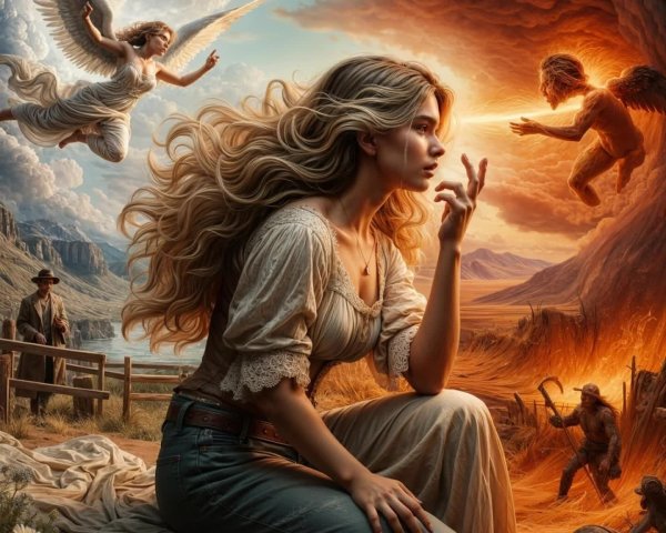 Prompt: "Design a blonde long wavy hair cowgirl, a corset with a futuristic yet western design, all against an extreme detail backdrop that borders on old west surrealism"