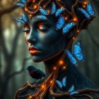Prompt: (A masterpiece of unparalleled excellence), This is a stunning and colorful close up image, created in the patchwork style of Hajime Sorayama and Tomasz Setowski.((A woman, likely in her late 20s or early 30s, with striking cobalt blue skin, intensely expressive eyes, and full lips. Her attire is a lavish, ornate design of delicate, metallic structures and vibrant flower decorations, crafted to accentuate her form. Intricate jewelry, resembling precious stones and metal filigree, adorns her neck and ears. The overall aesthetic evokes a sense of surreal fantasy, with a touch of neoclassical grandeur. A miniature, detailed city, complete with buildings and trees, is situated within a translucent orb that fills her head. A detailed, pinkish-purple full moon sits above this interior landscape. The lighting is dramatic, highlighting the intricate textures and details of her face and jewelry. The color palette consists primarily of deep, saturated blues, complemented by pinkish-purple and hints of gold. The background is a rich, dark black, drawing attention to the subject's vibrant features. The composition is full-body, but focused on the face and upper body to showcase the unique design. A detailed, decorative style, combined with a strong sense of fantasy, creates a captivating and ethereal mood. The image is meticulously crafted, employing techniques that could be described as photorealistic digital art)). Full size image.