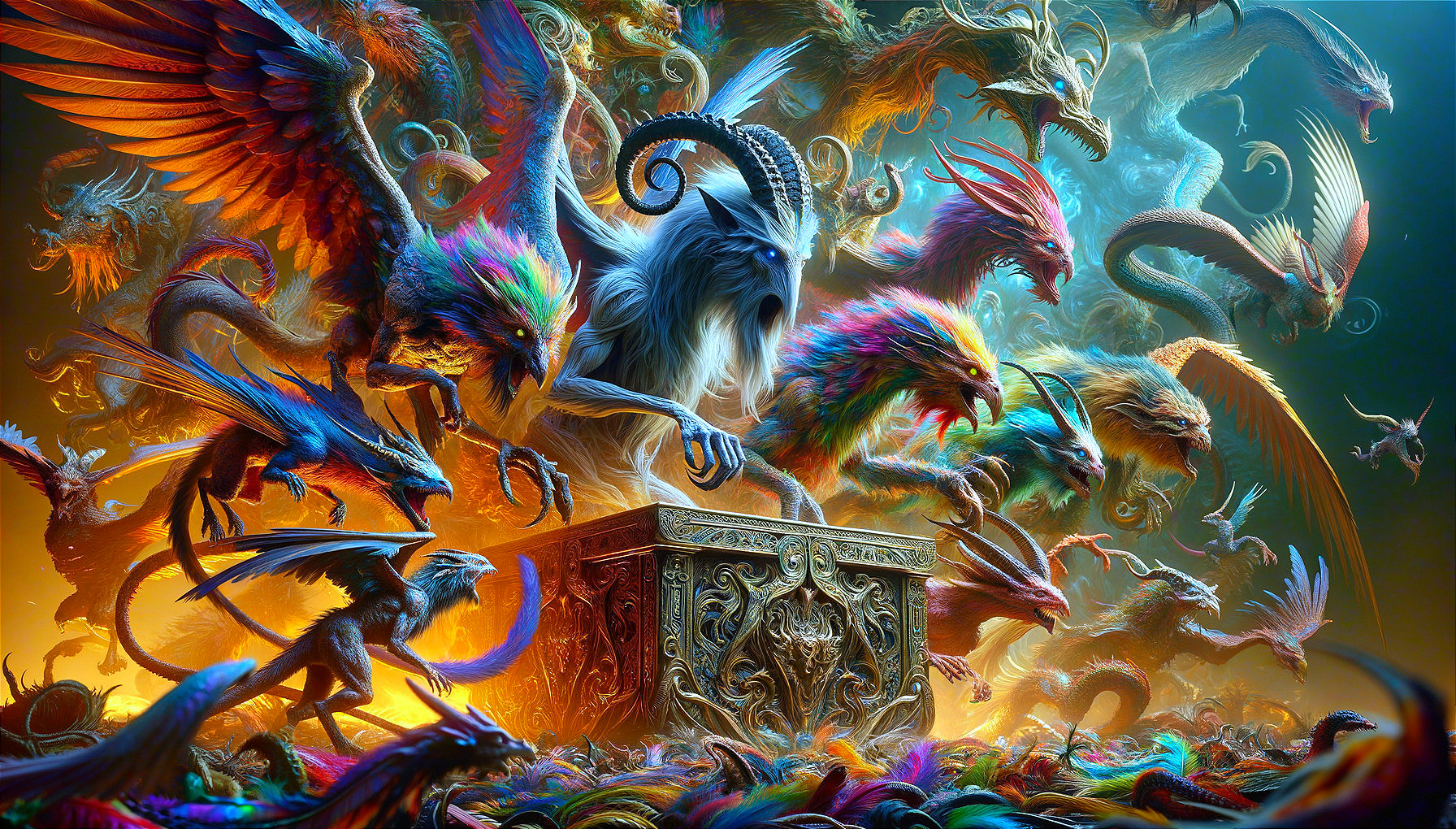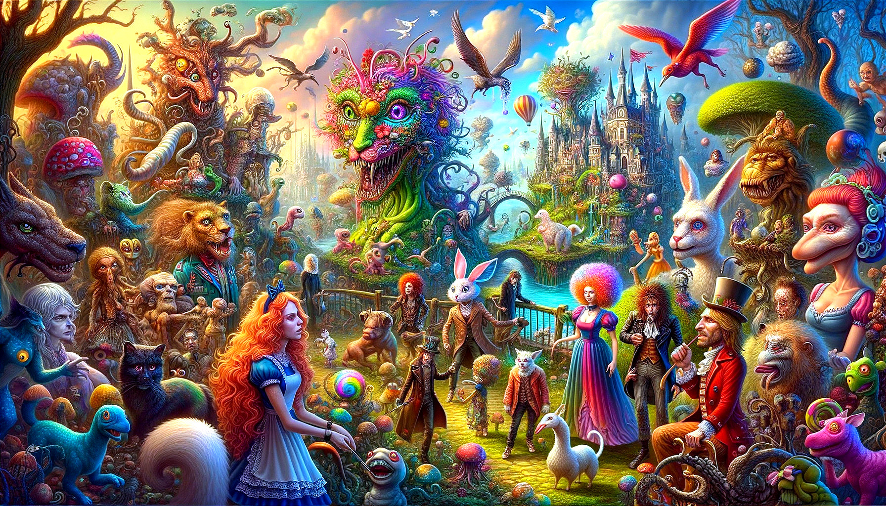 Prompt: Alice in Wonderland with many weird creatures - style by Roger Dean - ultra high quality, sharp focus, focused, high definition, extremely detailed, colourful, intricate, very attractive, very cute, elegant, fantasy, beautiful, imperial colors, fantastic view