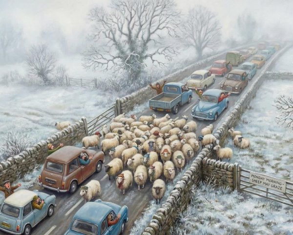 Prompt: Settlement in a frozen wasteland. Clarify figures and building detail with Anton Pieck. Soften sky with Apollinary Mikhailovich Vasnetsov. Retain vivid color saturation.