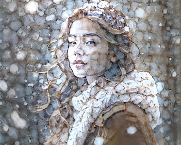Prompt: Oil painting cracked vintage canvas art surrealism, bright vibrant indigo blue, teal, white and light beige colors. remeniscent style and colors of Catrin Welz-Stein, Igor Maykov, Zdzisław Beksiński, Meghan Duncanson, and Yayoi Kusama, In the foreground on a small island stands a elegant slender young woman with long white hair and a long off-shoulder gown blowing in the wind, adorned with flowers. She's looking over the ocean with small boats sailing on it in the distance. A 3D crescent moon with a female face adorns the sky, amidst twinkling stars and clouds. the focus is on the cracked textures and the 3-dimensional highlighted figures of the woman and the moon that appear like a mixed media collage. Soft light illuminates the dreamlike scene.