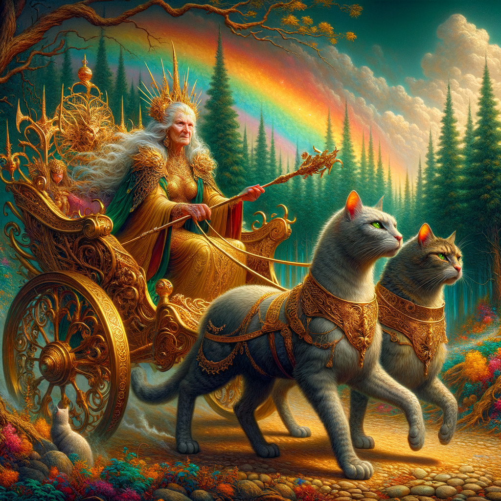 Prompt: elderly yet fierce, Freya the Norse goddess of war as an old woman looking fierce in armor, she is a seasoned war veteran galloping to war in her golden chariot pulled by 2 large grey tabby cats, she is an old woman, mature, much older, yet still a very beautiful and powerful warrior woman with her golden armor and golden chariot pulled by armored cats, rainbow colors, green forest background