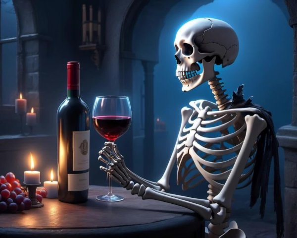 Prompt: A dark, eerie forest shrouded in mist, with skeletal figures emerging from the shadows. The central skeleton, adorned with a flowing purple cloak and a crown, wields a menacing staff. It stands confidently, its glowing red eyes piercing through the darkness. Surrounding it are other skeletal warriors, each with unique armor and weapons, posed menacingly. The background features a crumbling, ancient stone structure, partially obscured by fog and towering, gnarled trees. The atmosphere is ominous, with an otherworldly glow emanating from the ground.