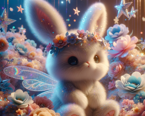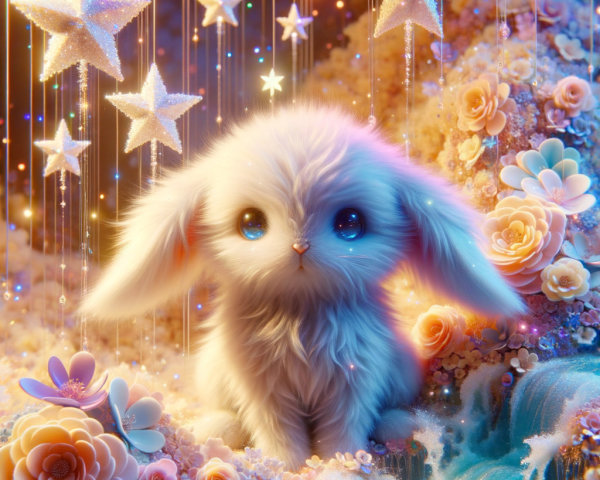 Prompt: Close-up shot. An adorable fluffy magical bunny cartoon sits among sparkling stars and pastel-colored flowers. Water flows from the stars, forming a waterfall around the bunny. Soft lighting, whimsical, pastel colors. Intricate, fantasy concept art, 4k resolution, trending on Deviantart, a masterpiece, best quality, vivid colors, dynamic lighting, complementary colors.
