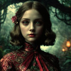 • Prompt: A striking female figure sits perched on a stone ledge, overlooking a gothic cityscape in a scene filled with rain. She embodies an ethereal character, adorned in a luxurious, tattered long red gown that cascades elegantly over the edge. Her skin tone is fair, contrasting beautifully with her fiery red hair, which cascades past her shoulders and is partially hidden beneath a pointed, horned headpiece that matches her outfit. The woman has an angular face with high cheekbones and a delicate jawline. Her eyes, piercing and intense, are a deep shade, possibly hinting at supernatural origins. Elegant arm guards encase her arms, complemented by delicate, dark wings that flap gently behind her, adding to her mystique. The background reveals intricately detailed gothic architecture, with looming spires and warm light spilling from windows, creating an atmosphere that blends beauty and darkness. Rain falls softly, adding texture to the scene and highlighting the character's solitary stance among the melancholic grandeur of the city.
